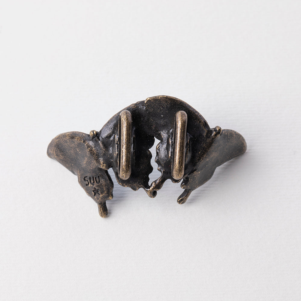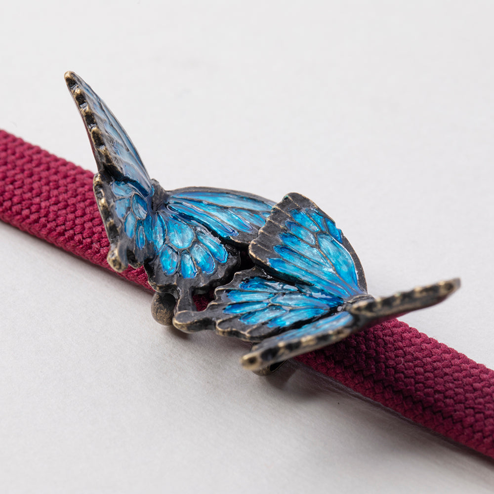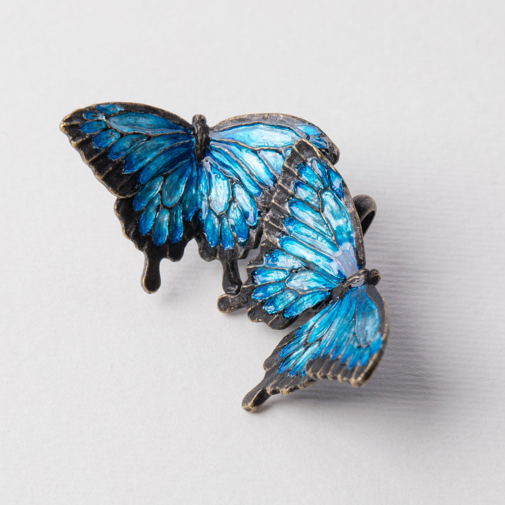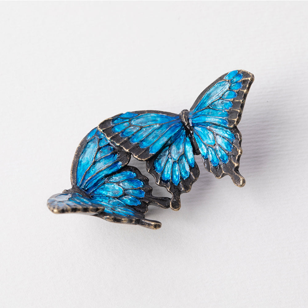 二羽のオオルリアゲハが飛び交う様子を切り取った立体的な帯留め。宝石のように輝く鮮やかな青色の翅は、まるで月明かりを閉じ込めたかのような神秘的な輝きを放ちます。羽根の着色は、鱗粉のようなざらつき感や鮮やかさが美しく映えるよう丁寧に施されました。まるで帯の上を飛び交うような立体的な造形にもご注目。