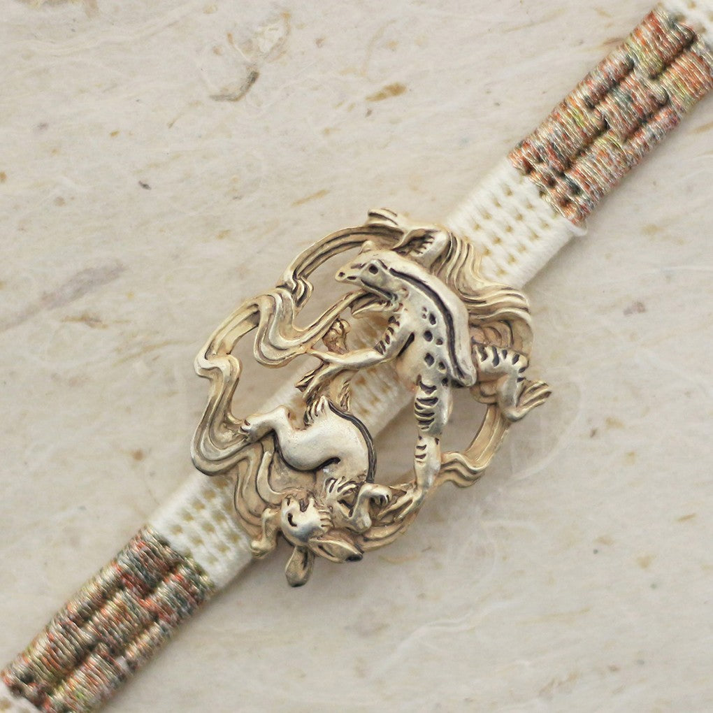第18紙に描かれている有名な相撲のシーンをブローチにしました。蛙の指先や兎の表情など、細部まで再現しています。枠は勝利した蛙の口から出ている気炎をモチーフにしています。