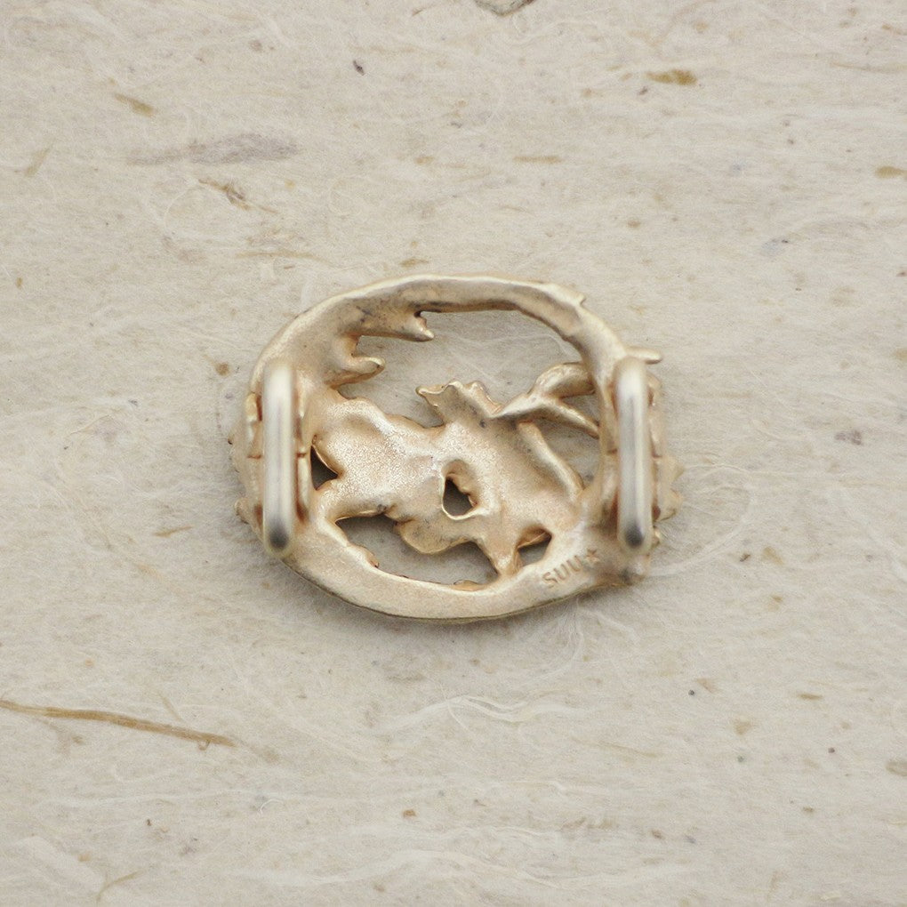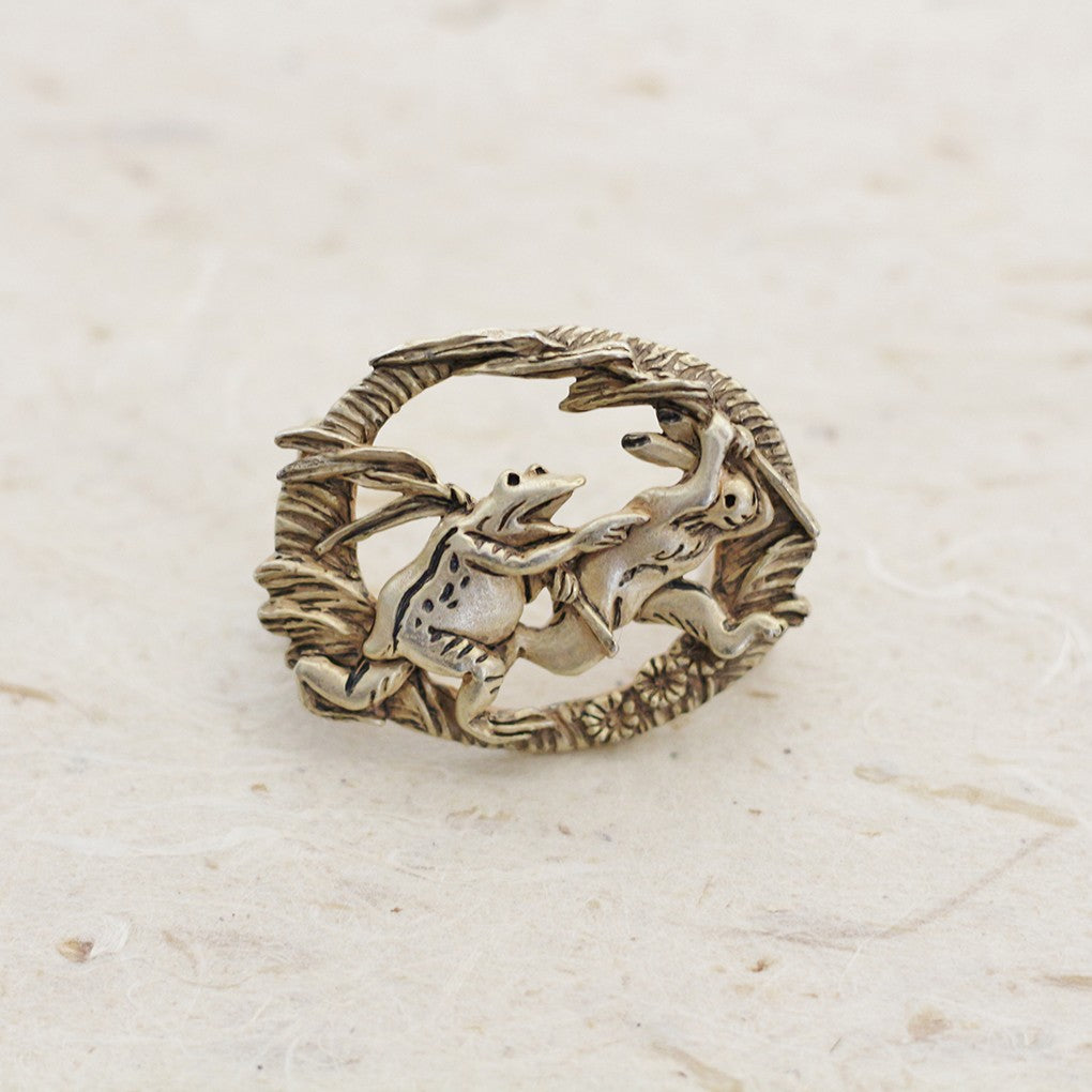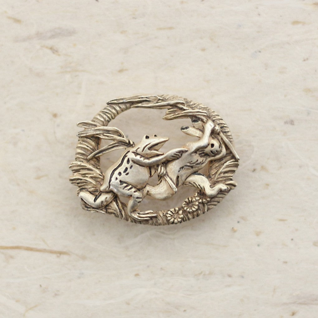第13紙に描かれている追いかけっこのシーンから兎と蛙を抜粋したブローチ。この「追いかけっこ」は印地打ちという石投げ合戦を描いたものではないかという説があります。旧正月や端午の節句に子供たちが遊んでいたそうです。